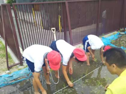 ビーチサンダルや長靴で田んぼに入ることも考えたのですが、両方とも田んぼで抜けなくなります。こわごわだった子どもたちも「気持ちいい!」とか言っている子が多かったです。たくましさはこんなところで身につくのかもしれません。