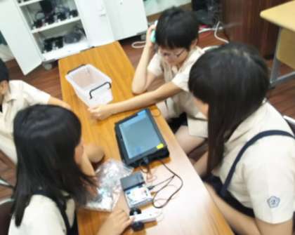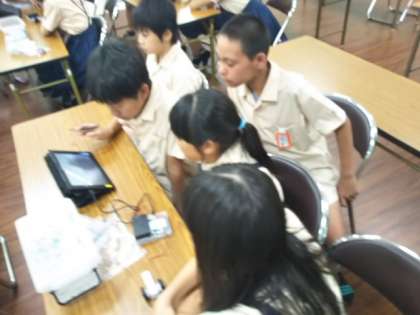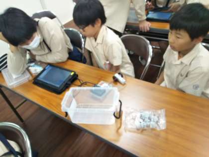 スタディーノというアプリを使って、( )秒前進する。( )ストップする。( )秒経ったら右に曲がる。などの命令(プログラム)をみんなで組み込んでいきます。