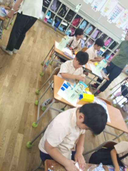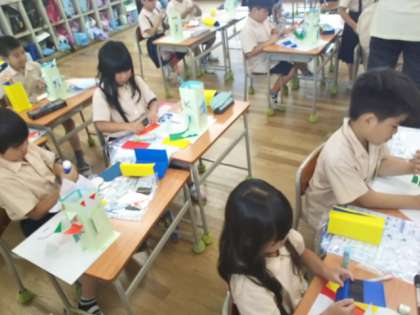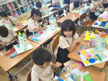 色どりもきれいです。池の上に橋がかかっていたり、秘密の部屋やブランコがあったり、夢いっぱいの「まどをあければ」の工作です。