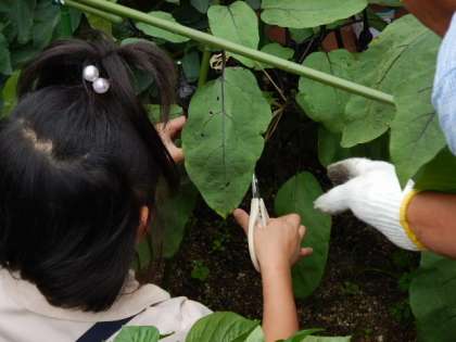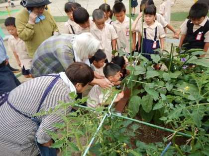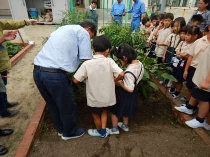 水やりは、平日は1年生とボランティアの方々、土日祝祭日は、ボランティアの方々です。八幡屋公園事務所の方々が毎週火曜日に来られて、ボランティアの方々に野菜が大きく育つコツを教えてくださいます。