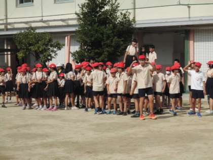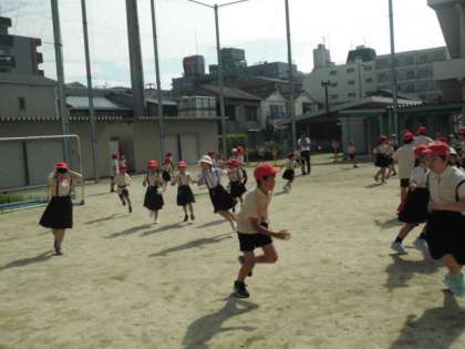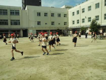 オニ役は高学年児童です。しっぽをとられた児童は、朝会台のあたりに帰ってきます。