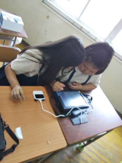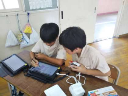 タブレットでプログラムを入力して、つないであるケーブルをはずして、電源をオンにすると、命令した時間が経つと犬のような鳴き声で「ハロー」などの音声が鳴りました。