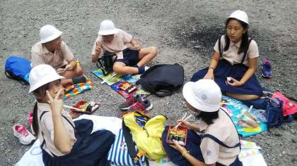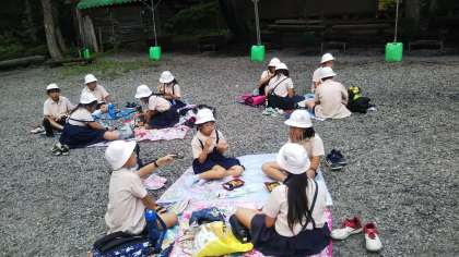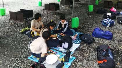 おなかが、ペコペコです。お弁当を食べます。日なたも涼しいのです。