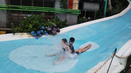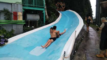 ウォータースライダーです。前の人がいなくなったら滑る。一緒に滑るのは3人までなどの約束を守って滑ります。