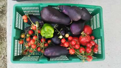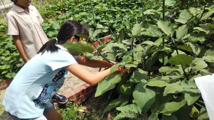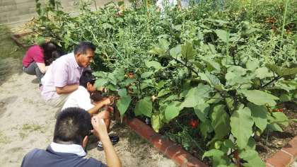 地域のボランティアの皆さんと1年生が学習園で、育てていたナス、トマト、ミニトマト、ピーマン等を収穫しました。八幡屋公園事務所、区役所の方の応援で立派に良く育ち、沢山の野菜ができました。