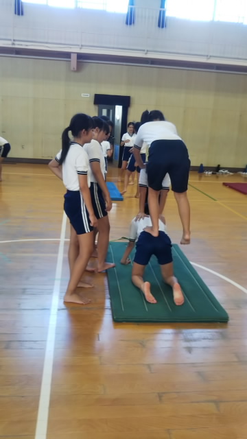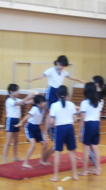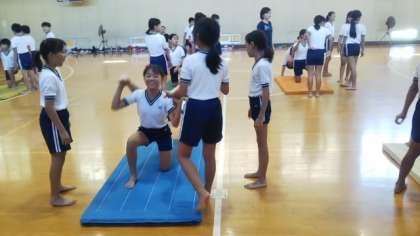6年生が、4時間目に確認した3人組の技を、まず見せて5年生に伝えました。