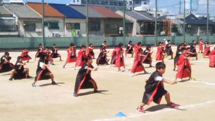 3年は赤のはっぴ、4年は黒のはっぴで踊ります。