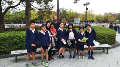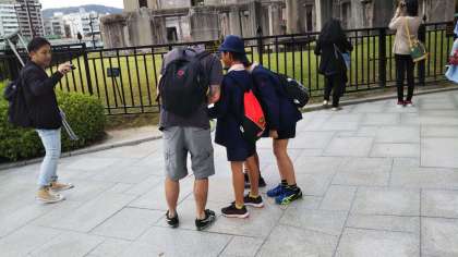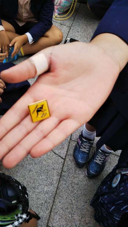 外国人観光客との交流にもチャレンジしました。ピンバッジをいただいたりした子も