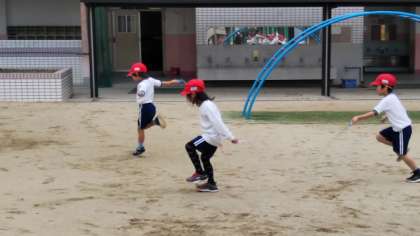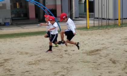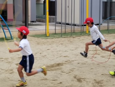 1年生が、なわとびでかけ足をしています。