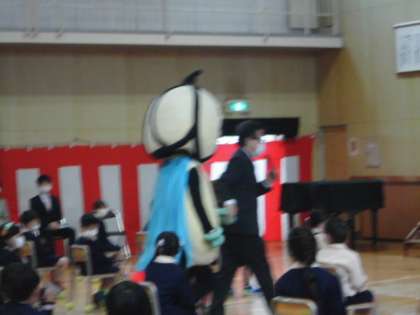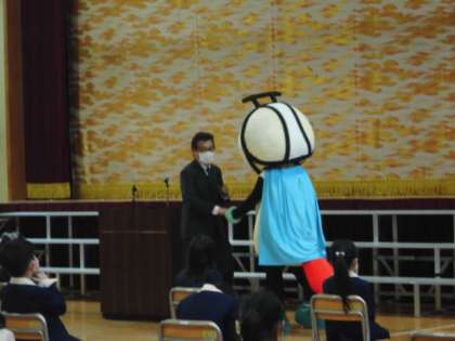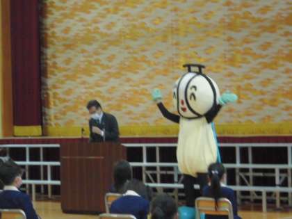 保護者のみなさまには、小雨模様のなか、多数ご来校いただき誠にありがとうございました。学校生活の説明にゲストとして西成区のマスコットキャラクターのジャガピー君が登場しました。