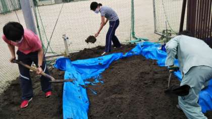 5年生の担任の先生と管理作業員さんが、2日がかりで、田んぼの土を全部出して、新しいブルーシートで水のもれない水田を作りました。