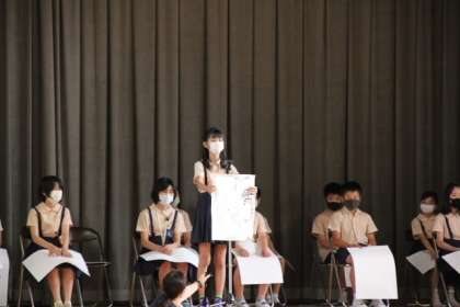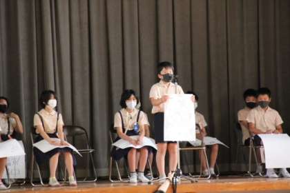 全校児童が、ソーシャルデュスタンスをとりながら集合しました。