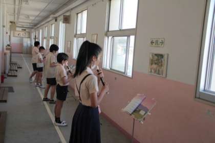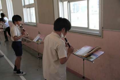 2m以上距離をとって演奏したいので、ろうかに譜面台を置いて半分ずつ演奏しました。