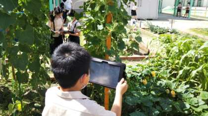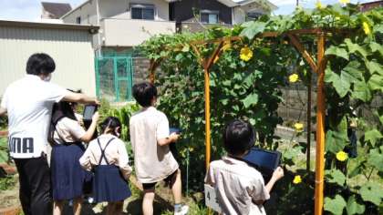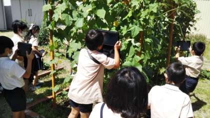 4年生が、ひょうたんの成長をタブレットで記録しています。