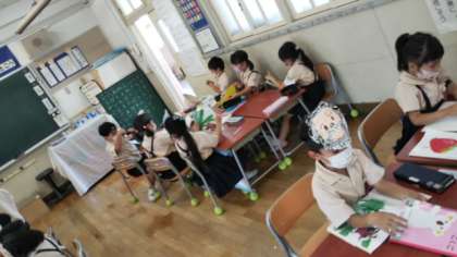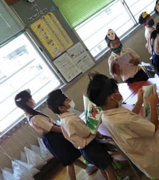 ねずみやねこ、おじいさんの絵を描いて(先生はお面と言っています)おでこのところにかぶりました。