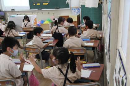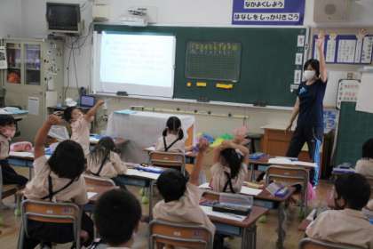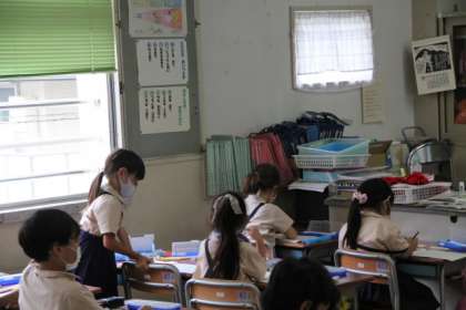 「あかのいろがみが1まい、あおのいろがみが3まい、みどりのいろがみが5まいあります。ぜんぶでなんまいですか。」というもんだいを考えています。
