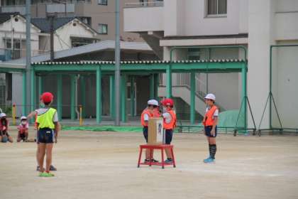台の上に乗せたまとにボールを当てる「まとあてゲーム」です。