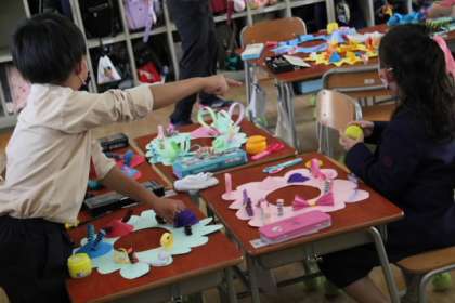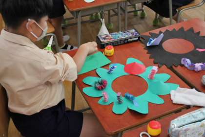 色画用紙を「ねじる」「重ねる」など、いろいろ工夫して、ぼうしのかざりを作っています。