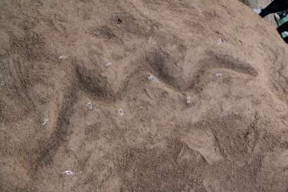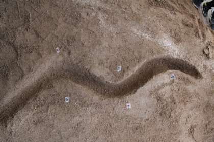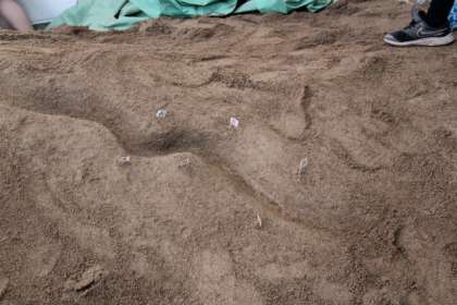 流れの内側と外側に、旗を立てて流れる水によって土の削れ方やたまり方の目印を作りました。
