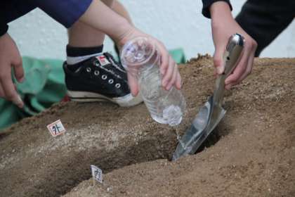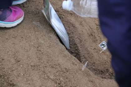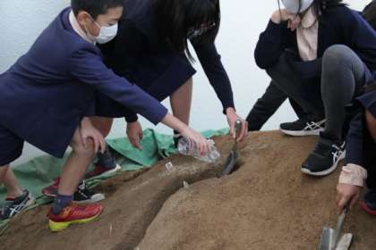 水を流して、水の流れによって上流の土が運ばれて、下流にたまったり、削られたりする様子を実験で確かめました。