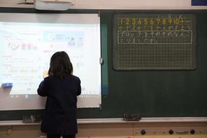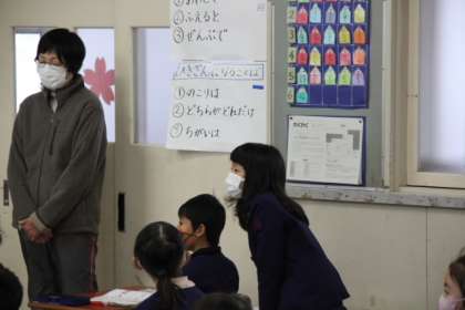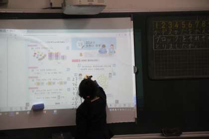 工夫して数えている友だちの考えを聞きました。「ブロックにしるしをつけながら数える」「5のかたまりにして数える」「10のかたまりで数える」・・など良いアイデアがたくさん出てきました。