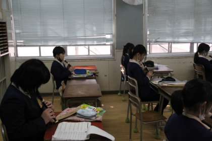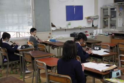 5年生は、ディスタンスをかなり開けて「威風堂々」を練習しています。