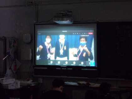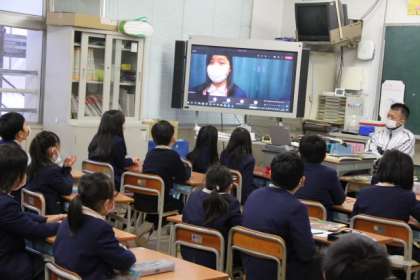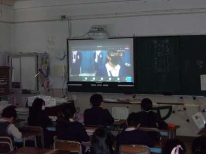 各学級で、大型テレビやスクリーンを通じて、6年生の歌やメッセージを見ています。