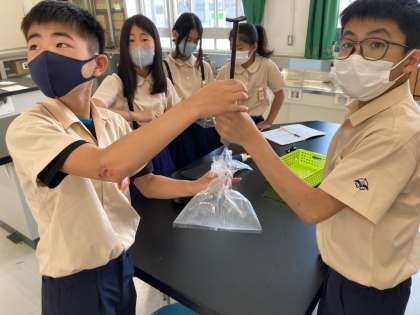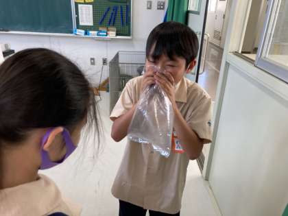 6年生は理科で人の呼吸について学習しています。今日ははいた息に含まれている気体について実験しました。気体検知管や石灰水などを活用して調べました。