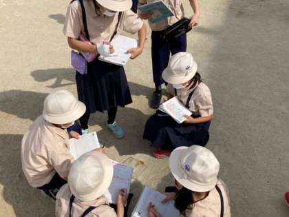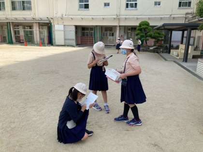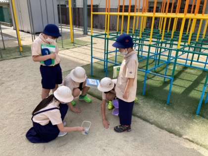 4年生は理科の学習で水の流れと地面のかたむきの関係について調べています。運動場で雨上がりの地面を見て、水の流れた後を観察してビー玉を使って地面のかたむきを調べました。