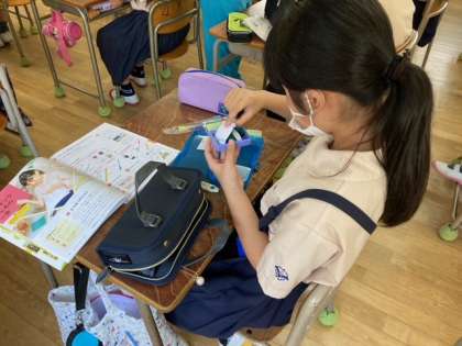 5年生は新しく始まった家庭科の学習で裁縫をします。今は裁縫セットの道具の名前や使い方の確認をしています。針と糸をうまく使えるか、楽しみですね。