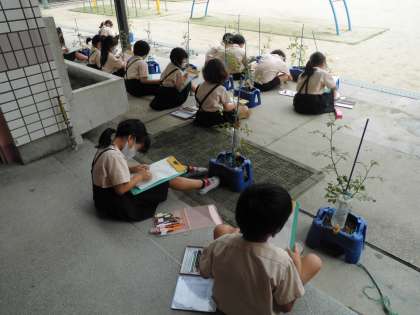 2年生は育って実ができたミニトマトの観察をしました。自分でお世話をして育てたミニトマトなので楽しそうに観察して、絵をかいたりメモを書いたりしました。