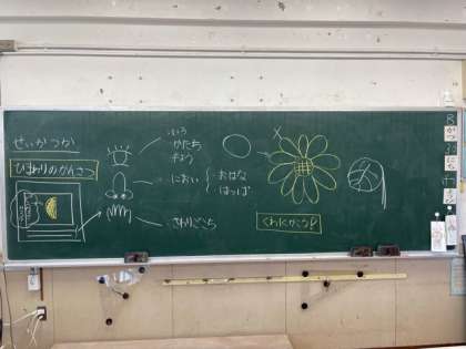 今日は夏休みに生長したひまわりの観察をしました。「この時期のひまわりって、こんな形をしてるんだなぁ」と、改めてみると、新しい発見ができたようです。今日も素敵な勉強ができましたね。