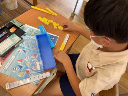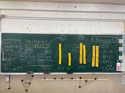 1年生の算数では10より大きい数の学習を進めています。今日は教科書の魚とヒトデの数をブロックを重ねて数えました。これは「一対一対応」といい、魚の数とブロックの数を対応させて理解を深める工夫をしています。こういう勉強がやがて大きな数を数える時に役立ってくるので、しっかり覚えてほしいと思います。また、「16」や「19」という数に着目して、10と○という見方や考え方を交流しました。「20」の見方は見事な意見が出てきていました!!