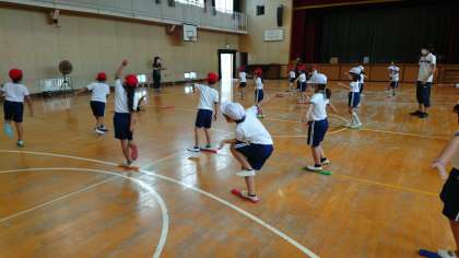 スポーツの秋。運動しやすいさわやかな日がつづきますね。1年生は体幹をきたえバランスをよくするスラックレールを使ってたのしく運動しました。目標の20秒。