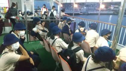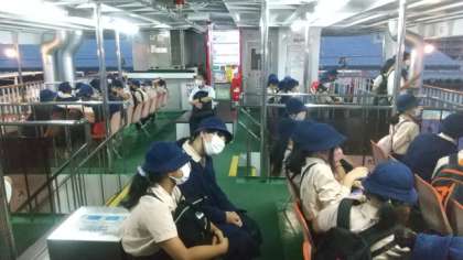 広島から宮島へ船に乗って移動しています。 ちょっとお疲れ?
