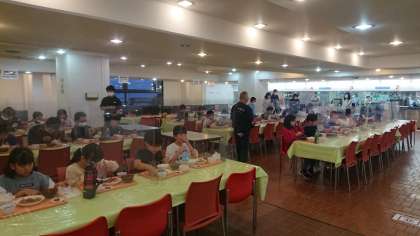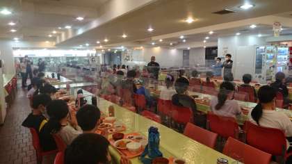 カッターボート体験が終わり、シャワーや着替え、ベッドメイキングなどを済ませ、夕食の時間になりました。活動の後は、おなかが減ります。それではみんなで「いただきます!」