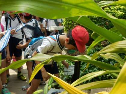 咲くやこの花館で様々な植物を観察しました。アイスクリームによくつかわれるバニラの香りをかいでいます。(写真上中)