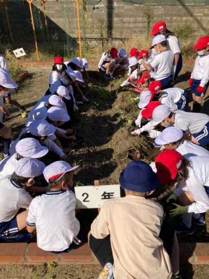 学習園で育てていたさつまいもを2年生は収穫しました。大きいものや小さいもの、連なっているものなど様々な形があり、子どもたちは喜んでいました。