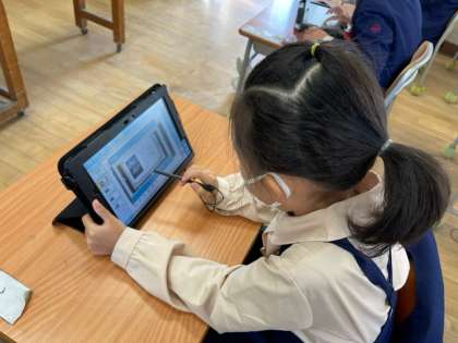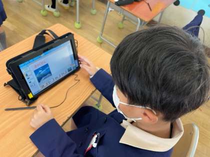 1年生の国語では「いろいろなふね」の学習を進めています。船の役割などの説明文の読み取りをタブレットを活用して理解を深める工夫をしています。