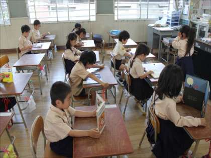 5月15日 金曜日の読書タイムの様子です。オルゴールのかわいいかすかなBGMが流れるなか、どの学年も静かに読書をしています。写真上(1−1)写真中(1−2)写真下(2−2)です。