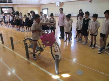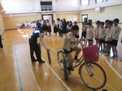 自転車安全大会と同じコースで自転車の運転技術を確認しました。ジグザグコースや狭いコースで自転車を思うように運転できない児童がたくさんいました。