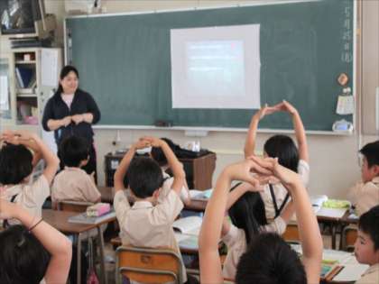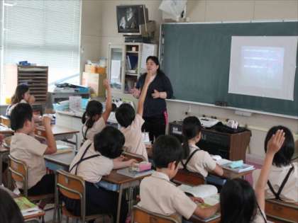 Iパッドとプロジェクターで、「バスケットボールは、粗大ごみ?○化か×か!」(こたえ ふつうゴミ)「牛乳パックは、何ゴミか?」(こたえ 古紙)など、少し考えなければいけない問題に子どもたちは積極的にチャレンジンしていました。