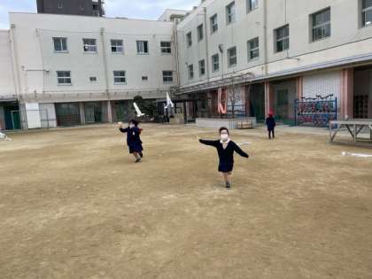 今日、1年生は自分たちでつくった凧で、凧揚げをしました。うまくあげることができて、子どもたちはとても喜んでいました。