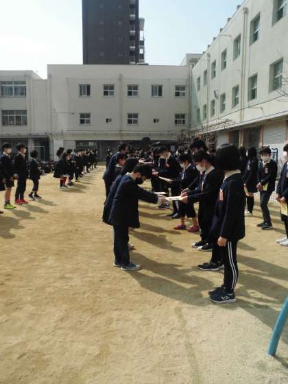 映像を見た後、講堂では6年生からのお礼の気持ちとして、ダンスのプレゼントがありました。その後、運動場で6年生へプレゼントを渡しました。