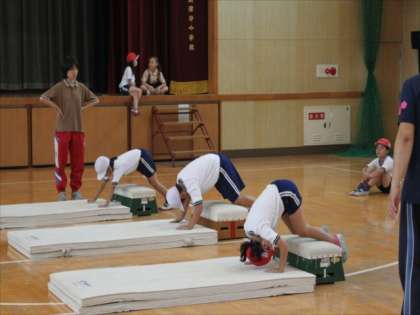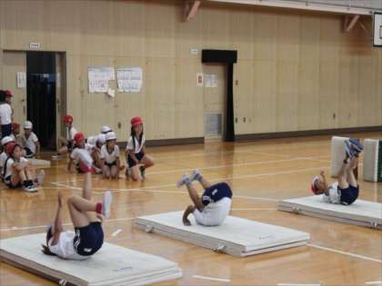 3年生が、マット運動で、前ころがり、前転にチャレンジしていました。頭の後ろ、首の後ろ、背中、おしりと順番につけて回ること、ころがる勢いをつけることがとても大切です。