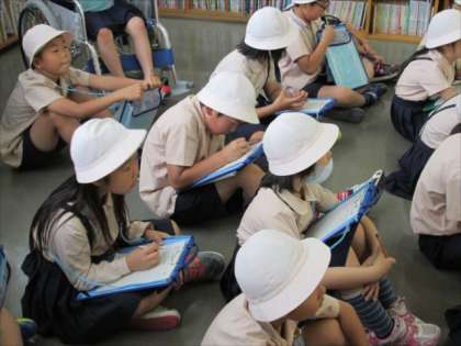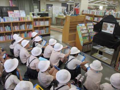 まず、大阪市の図書館の所在地についてや、図書館に行ったときの本の借り方などをかみしばいなどで教えていただきました。