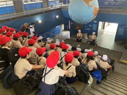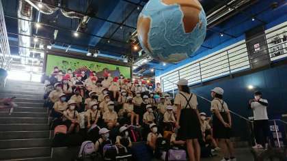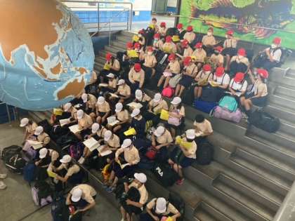 海洋センターに到着しました。大きな地球儀の下で入舎式です。気持ちを引き締めて、海洋センターのみなさん、どうぞよろしくお願いします。