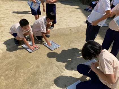 4年生の理科では水の流れについて学習を進めています。理科の時間と雨がなかなか重ならなかったので、人工的に水の流れを作り、ビー玉を使って実験・観察を行いました。
