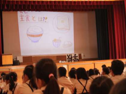 「スイッチ1 五感を刺激し、体が目覚める。」「スイッチ2水分と栄養を消化吸収する。」「スイッチ3体温が上がる」「スイッチ4 脳が活発の働く」「スイッチ5排便をうながす。」など 「朝食を食べるとこんないいことがあるよ」「朝食食べようよ」というメッセージは児童全員に響いたと思います。