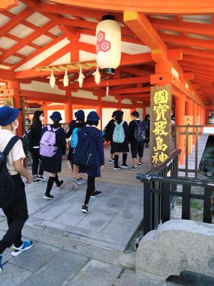 厳島神社の見学の様子です。海上に立つ貴重な世界遺産を興味深く見ています。